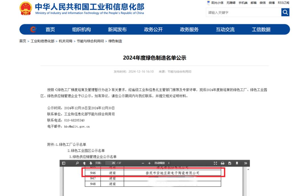 在可持續(xù)發(fā)展浪潮澎湃的當(dāng)下,工業(yè)領(lǐng)域的綠色轉(zhuǎn)型成為時(shí)代的必答題。近日,工業(yè)和信息化部公布了《2024年度綠色制造名單》,安地亞斯憑借在綠色制造領(lǐng)域的卓越表現(xiàn),榮獲“國家級(jí)綠色工廠”稱號(hào),此榮譽(yù)是公司在綠色制造領(lǐng)域首創(chuàng)突破,更是為電子陶瓷行業(yè)樹立了新標(biāo)桿。
